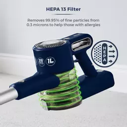 Effortlessly achieve a more efficient and deeper clean around the home with the VL35 Cordless 3-in-1 Pole Vacuum. Its powerful built-in rechargeable battery delivers up to 35 minutes of continuous run time from a single charge for hassle-free cleaning. Use as a cordless vacuum for carpets and hard floors, a detachable handheld for cars, stairs and upholstery or extend the pole for higher hard-to-reach areas like ceilings and curtains. The cyclonic suction provides consistent airflow, effortlessly sucking up and breaking down dirt from all floor types for a thorough clean.  This product benefits from an anti-tangle floor head, preventing hair build up around the brush head. It transforms into a handheld vacuum that is perfect for staircases, cars and upholstery. An anti-allergy HEPA filter removes 99.95% of fine particles from 0.3 microns, making it ideal for allergy sufferers. Its ultra lightweight 2.5kg body is easy to carry and move from room to room, for cleaning up high or down low anywhere in the home.