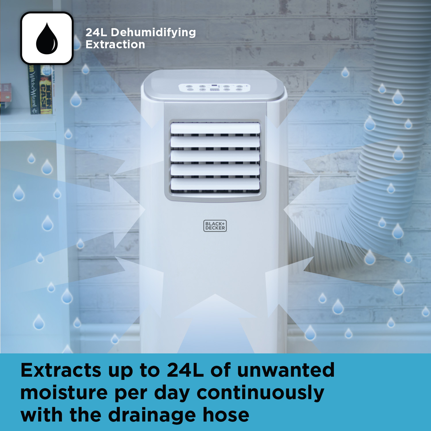 The 0.5L water tank is designed to extract up to 24.8 litres of unwanted moisture per day with the continuous drainage hose to evaporate the water.