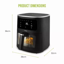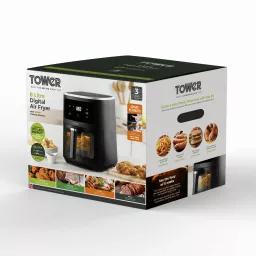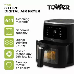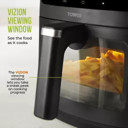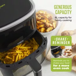 Enjoy complete family cooking with this 8L Air Fryer from Tower. Featuring Vortx technology, food will cook 30% faster than in a conventional oven, for delicious crispy meals that requires little to no oil. The large capacity will let you cook full family meals with ease, so you can comfortably fit a whole meat joint or cook larger portions of your air fryer favourites. Choose from 6 cooking pre-sets to take the fuss out of cooking, including Air Fry, Bake, Roast, Grill, Reheat & Keep Warm. A temperature range of 80-200°C and 60 minute timer allows for more precise cooking, allowing you to tailor the cooking process to suit your lifestyle. The large Vizion viewing window lets you monitor the cooking process without having to open the drawer, saving both time and energy in the kitchen. The digital control panel offers seamless use, so you can filter between the pre-sets, set the timer and temperature with ease. A handy shake reminder will appear on the screen 2/3rds of the way through cooking, so you can remove the basket for a more thorough and even cook.