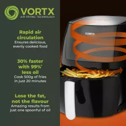 Uses Tower's rapid air circulation technology to cook your food 30% faster with 99% less oil and uncompromised fried taste - you lose the fat, not the flavour