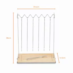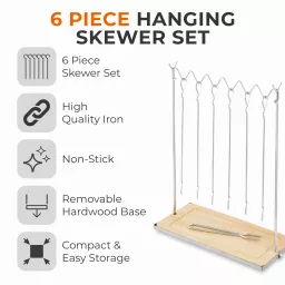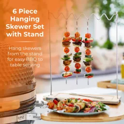 Includes 6 skewers with individual hanging hooks to hang the skewers from the stand, for easy BBQ to table serving
