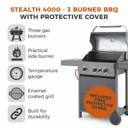 This Tower Stealth three burner BBQ lets you grill a wide range of succulent meats to a perfect texture and consistency using the precision heat thermometer. It comes with a protective cover that is resistant to wind and rain to protect your grill from the elements for long-lasting quality. The porcelain enamel coated cast iron grill is highly durable and helps retain large amounts of heat providing a more efficient and reliable grilling. The BBQ features a side burner for both grilling and sauteing ingredients, as well as extra storage for your sauces. A fat collector tray collects all of the excess fat, which can be removed and easily cleaned to maintain performance. The sturdy heavy gauged steel body is rust proof so you can use it all year round and provides protection when stored outside. Integrated robust wheels make for easy portability and an included front panel disguises the gas bottle for a more pleasing appeal.