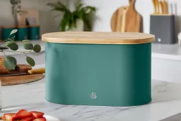 Swan's smart and stylish Nordic Oval Bread Bin is made from durable carbon steel and is designed to keep your loaves, cakes and pastries fresher for longer. With a generous capacity and measuring H34.5 x W18.5 x D16.5cm, it's the ideal choice for storing large quantities of baked goods. The bamboo lid doubles as a cutting board so you can easily prepare fresh ingredients, whilst the carbon steel body offers durability and long lasting quality. Inspired by Scandinavian minimalist design, it comes in soft touch blue complete with a bamboo cutting board lid.