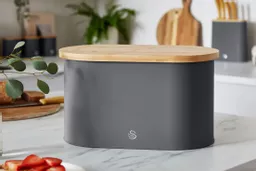 Swan's smart and stylish Nordic Oval Bread Bin is made from durable carbon steel and is designed to keep your loaves, cakes and pastries fresher for longer. With a generous capacity and measuring H34.5 x W18.5 x D16.5cm, it's the ideal choice for storing large quantities of baked goods. The bamboo lid doubles as a cutting board so you can easily prepare fresh ingredients, whilst the carbon steel body offers durability and long lasting quality. Inspired by Scandinavian minimalist design, it comes in soft touch blue complete with a bamboo cutting board lid.