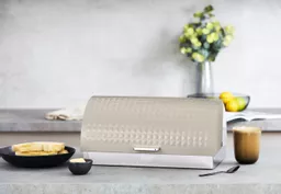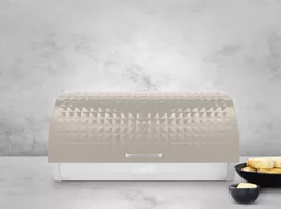 Tower’s Solitaire bread bin provides premium storage for your fresh baked goods. Its stainless steel design coated in a sleek colourway give your countertop a touch of contemporary appeal. The built-in ventilation system traps moisture to prevent goods from drying out, preserving their fresh texture and taste for longer. A large inner capacity provides enough room to store bread loaves, crumpets and bagels of varying sizes, complete with roll top lid and bar handle to easily access held contents. Its durable stainless steel body requires just a simple wipe down to maintain the pristine finish.