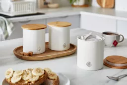 The Swan Set of 3 storage canisters seamlessly blends functionality with elegant, minimalist design. Crafted from stylish carbon steel with a matte soft-touch finish and accented with natural bamboo lids, they add a touch of sophistication to any kitchen.