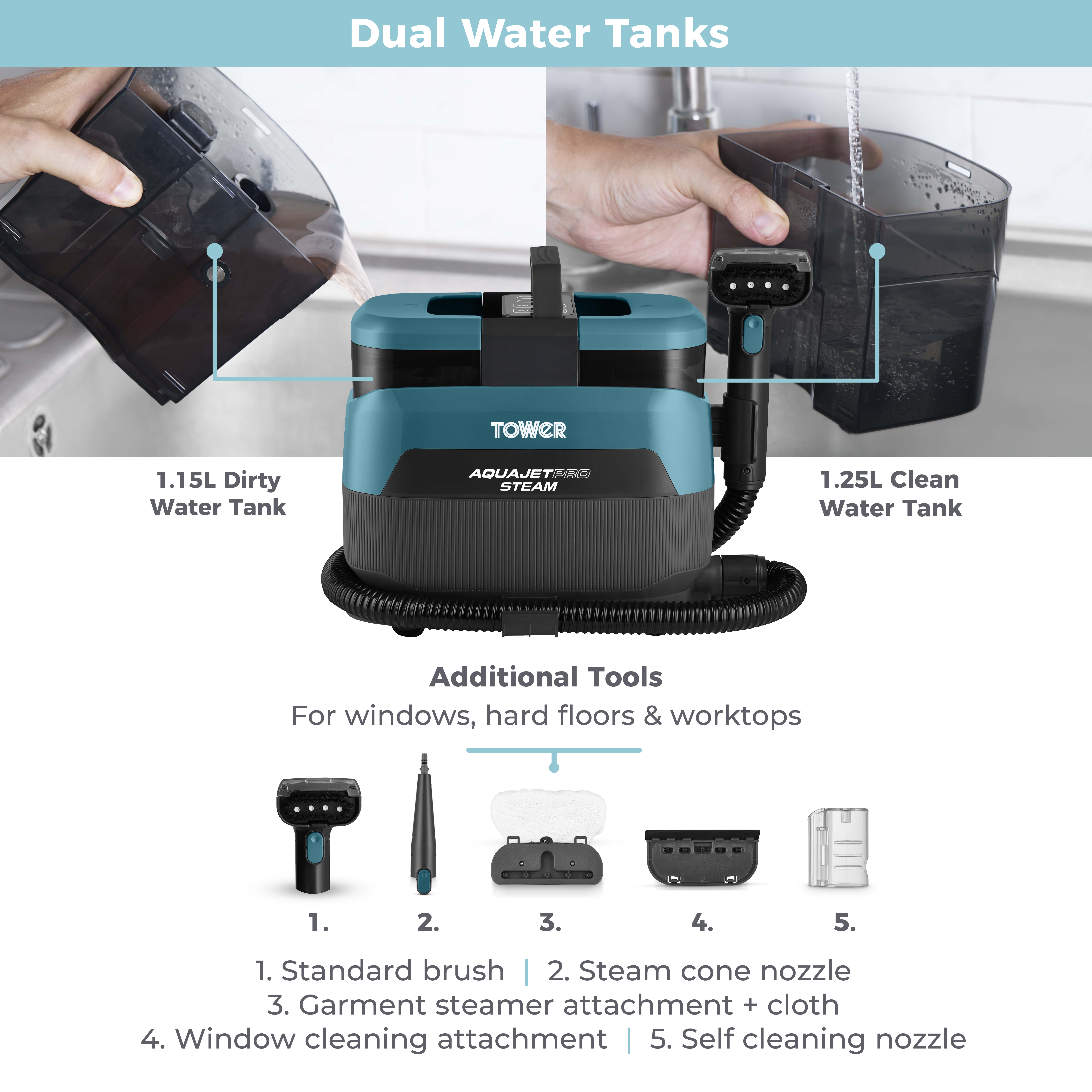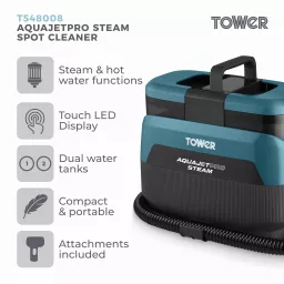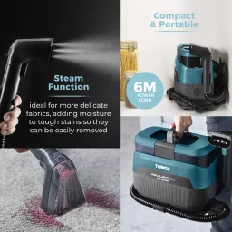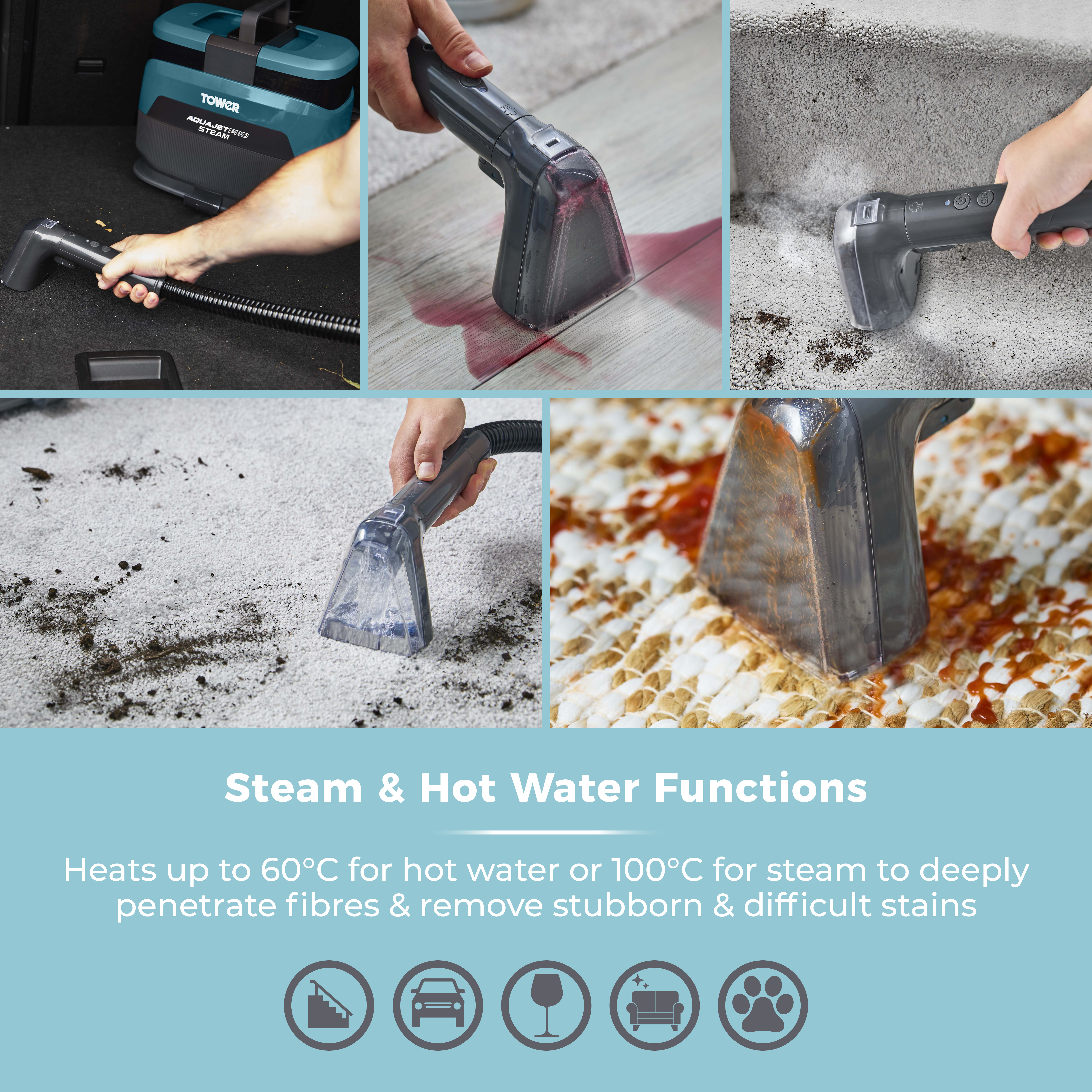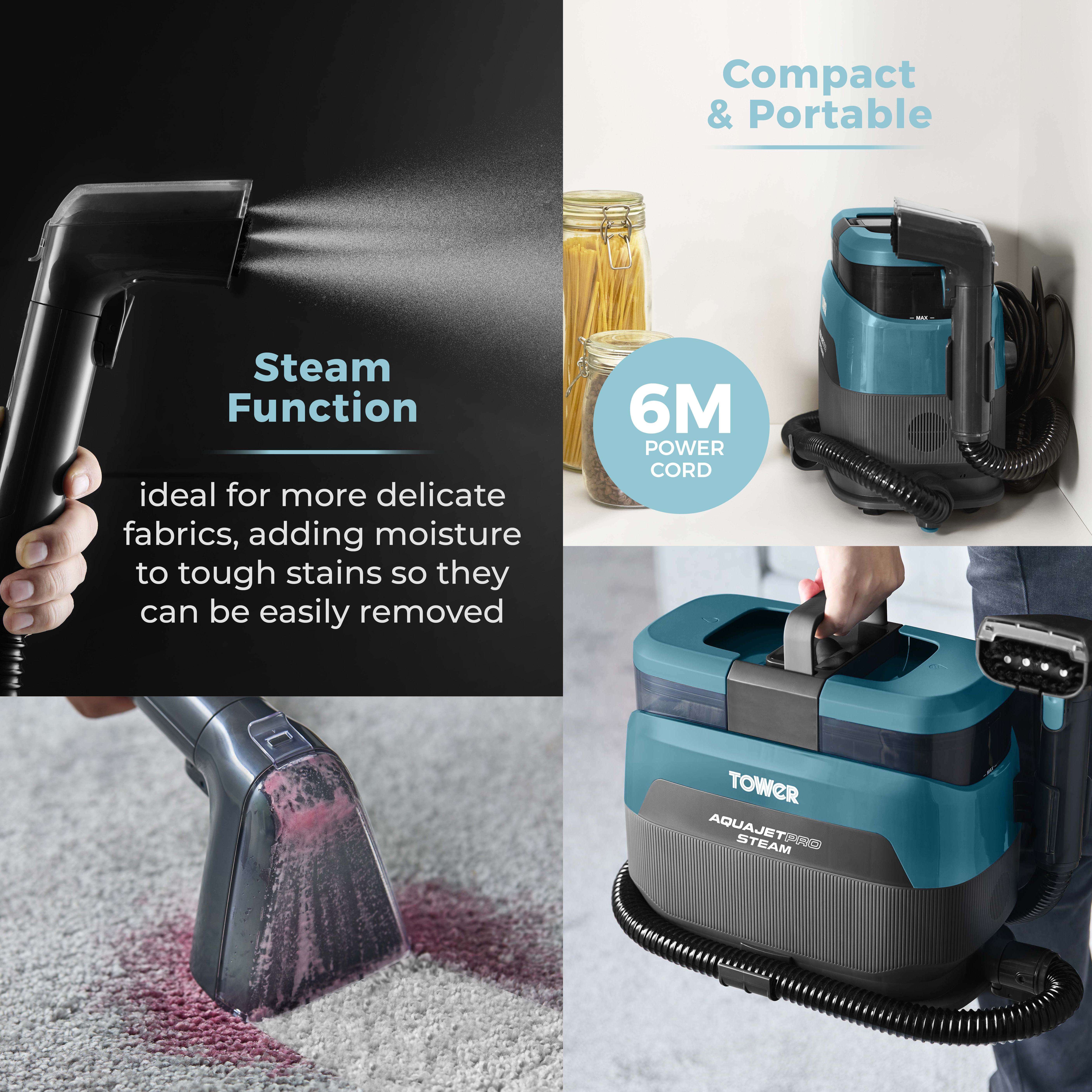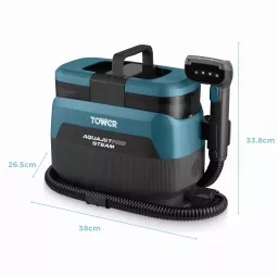 ??Breathe new life into carpets, floor, upholstery and car interiors with this powerful 450W AquajetPro Spot Cleaner from Tower. It expertly utilises steam and hot water to deeply penetrate carpet fibres so you can effortlessly eradicate embedded stains to leave floors refreshed, whilst the cold spray function is perfect for added moisture to stains and marks on delicate fabrics. The powerful motor effortlessly agitates stubborn dirt and sucks up spilled drinks to make cleaning simple and leave your home looking fresher. Featuring dual water tanks, the 1250ml clean tank and 1150ml dirty water tank capacities will let you breeze through cleaning without constantly refilling and ensure you are consistently nurturing your floors with clean water. The high powered performance can remove stubborn stains with ease and penetrates deep into fibres to remove embedded dirt and refresh your carpet. It comes with a window cleaning attachment that will let you scrub windows until they are crystal clear, whilst the steam brush and nozzle attachments offer full versatility so you can refresh every room in your home. Lightweight and portable by design, you can easily move from to room to tackle cleaning tasks across the home. ?