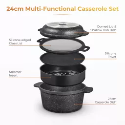 Versatile casserole dish allowing you to enjoy mouth-watering slow-cooked meats and tasty one-pot stews. Poach or stew on the hob, or roast and slow cook in the oven. The set includes a 24cm casserole dish with silicone-edged glass lid, a domed aluminium lid, which also doubles as a shallow hob dish, an aluminium steaming tray and a silicone trivet to protect your worktop from burns