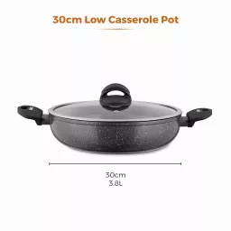Cook deliciously wholesome, slow-cooked casseroles and hearty stews with the Tower 30cm Low Casserole Pot. Featuring high-grade non-stick technology, the Cerastone coating is 5x stronger than other non-stick coatings, and is PFAS, PFOA, PFTE, lead and cadmium-free so you can enjoy healthy meals using little or no oil. Its high quality, long-lasting forged aluminium body enables quick and easy adjustment of temperatures for more efficient cooking results, with no hot spots. The casserole pot has softtex handles for comfortable control over your cooking, with a tempered glass lid that effectively seals in the heat to retain rich flavours and tender texture for perfect dishes. Its bonded steel base provides even heat distribution to ensure your food is cooked thoroughly, and is designed to work with any hob type including induction. The non-stick ceramic coating prevents food from sticking to the surface, and this casserole pot is dishwasher safe for an even easier clean after cooking.