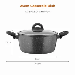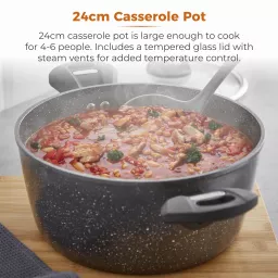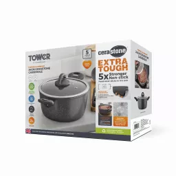 Cook deliciously wholesome, slow-cooked casseroles and hearty stews with the Tower 24cm Casserole Pot. Featuring high-grade non-stick technology, the Cerastone coating is 5x stronger than other non-stick coatings, and is PFAS, PFOA, PFTE, lead and cadmium-free so you can enjoy healthy meals using little or no oil. Its high quality, long-lasting forged aluminium body enables quick and easy adjustment of temperatures for more efficient cooking results, with no hot spots. The casserole pot has softtex handles for comfortable control over your cooking, with a tempered glass lid that effectively seals in the heat to retain rich flavours and tender texture for perfect dishes. Its bonded steel base provides even heat distribution to ensure your food is cooked thoroughly, and is designed to work with any hob type including induction. The non-stick ceramic coating prevents food from sticking to the surface, and this casserole pot is dishwasher safe for an even easier clean after cooking. Collect the full Cerastone range for all your best loved dishes, with 100% recyclable product and packaging.