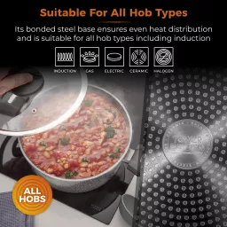 The bonded steel base provides even heat distribution to ensure your food is cooked thoroughly, and is designed to work with any hob type including induction