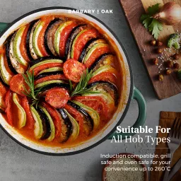 This Barbary & Oak 24cm Casserole Pan is a reliable cooking companion that any avid cook needs in their kitchen. The pan features quality cast iron that is durable and built to last. Cast iron retains heat, meaning it keeps food warm for longer making it perfect for those who love to make delicious casseroles for the family. The enamel interior prevents food from sticking, is easy to clean, and will not absorb odours or flavours. Versatile in design, the casserole pan is suitable for all hob types including induction and also grill safe and oven safe up to 260°C. A domed lid is included, which helps lock in and retain all the moisture to ensure your food is tender with an enhanced flavour. Crafted with 2 handles, they provide an easier grip for carrying food from the oven to the table.
