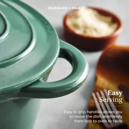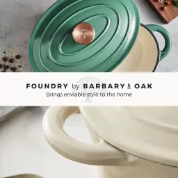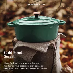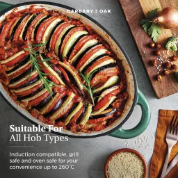 This Barbary & Oak 29cm Oval Casserole Dish is a reliable cooking companion that any avid cook needs in their kitchen. Designed in an array of classic shades, the pan features quality cast iron that is durable and built to last. Cast iron retains heat, meaning it keeps food warmer for longer making it perfect for those who love to make delicious casseroles for all the family. The enamel interior prevents food from sticking, is easy to clean, and will not absorb odours or flavours. Versatile in design, the casserole dish is suitable for all hob types including induction and also grill safe and oven safe up to 260°C. A domed lid is included, which helps lock in and retain all the moisture to ensure your food is tender with an enhanced flavour. Crafted with 2 handles, they provide an easier grip for carrying food from the oven to the table.