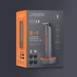 Carmen's Titan 3-in-1 Cordless Clipper Set provides the ultimate tools to chisel facial hair and create a defined jawline. With a precision trimmer to shape beards, sculpt sideburns and maintain your moustache, it's easy to achieve the look you want for any occasion. The detail trimmer helps to create chiselled hair lines with added definition around your jaw, with additional hair clipper to tame unruly hairs before creating your style. The advanced, rechargeable battery provides up to 35 minutes of cordless runtime, for a great shave without restrictions. Superior performance titanium blades provide long-lasting sharpness for a pristine finish every time. Create custom looks with 4 cutting lengths from 3-12mm to suit every style, providing ultimate versatility for face and body grooming. Its ergonomic and slim design is a perfect fit for your hand, so you can comfortably and efficiently trim your face or body.