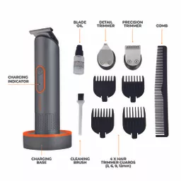 Accessories include: Hair combs/ Blade oil/USB charging cable/ Base stand and Cleaning brush