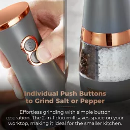 Two individual push buttons to grind salt or pepperEasy to fill clear acrylic chambers with large capacity