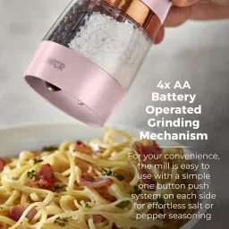 Tower’s electronic duo salt and pepper mill in grey and rose gold are a must-have essential for your dinner table. The elegantly designed duo mill includes a battery-operated mechanism that adds a touch of class to any evening meal. Featuring an adjustable grinder function, you can choose whether to have fine or coarse salt and pepper seasoning suited to your taste. The clear acrylic chambers in the main body offer viewing windows so you can keep an eye on the level of the contents for a top up and for added convenience. You only need to press a button for the mill to operate for effortless usage.