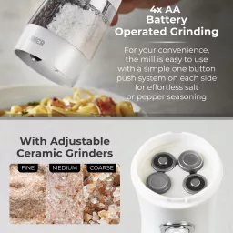 For your convenience, the mill is easy to use with a simple one button push system on each side for effortless salt or pepper seasoning. Requires 4x AA type batteries (not included).