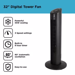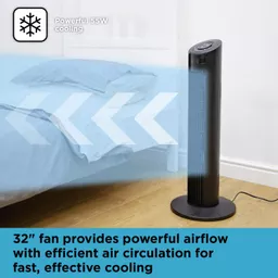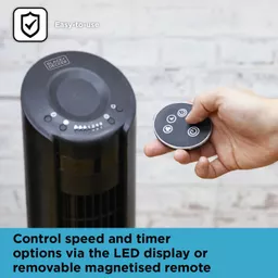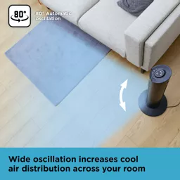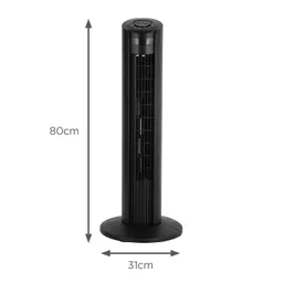 Quickly cool yourself down with the rapid cooling effect of this tower fan. The adjustable thermostat offers the choice of 3 different cooling settings, with a digital display that lets you easily take control of the temperature and set a timer for increments up to 8 hours. Rotary oscillation provides air coverage across a 80- degree angle to help keep you and the surrounding area cool. Switch between cooling settings using the remote control, which can be safely stored away in the built-in magnetic storage holder on top of the fan. Safety features include a tip over switch and automatic thermal cut-off for peace of mind, while the integrated carry handle allows for easy manoeuvring around the home or office. No assembly is required.