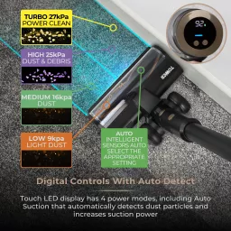 Touch sensitive LED display allows you to effortlessly cycle through 4 power modes, including the auto detect function. The floorhead automatically detects dust & increases the suction power in higher dust levels for efficient and effortless cleaning