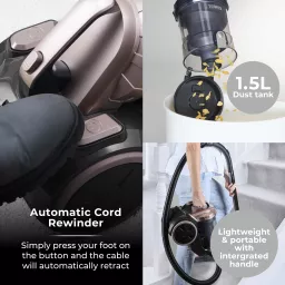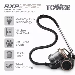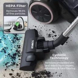 Packed with powerful suction and a high-performance motor, Tower’s bagless cylinder vacuum leaves floors refreshed and sparkling in no time. The vacuum cleaner uses multi-cyclonic technology with optimised suction and enhanced filtration to effortlessly collect dust and debris. The included crevice tool, floor brush and small brush are ideal for vacuuming hard to reach areas, refreshing your upholstery and removing deeply embedded dirt for a more thorough and complete clean. A built-in HEPA filter eliminates 99.95% of allergens by containing dust, pet dander and pollen to create a healthier living environment, whilst the 1.5L dust tank provides a large capacity for collecting dirt and debris without having to constantly stop and empty the tank. The vacuum is built for convenience with an integrated carry handle so you can move from room to room or even take the vacuum upstairs, whilst the 5-metre power cable lets you choose the most suitable plug socket for an extended reach. With a simple button press, the cable will retract into the vacuum for simple and efficient storage - no need to bend down and do it manually.