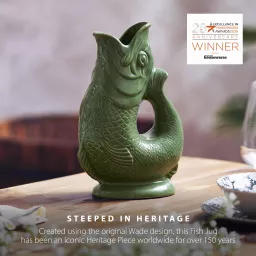Add a touch of UK ceramic heritage to your home with this 1.2L Fish Jug from Wade. Created using the original iconic Wade design that continues to delight homes across the world for over 150 years. This fish jug is the perfect statement piece for any home. Handcrafted in Stoke-on-Trent, the heart of the pottery industry using English Earthenware, it showcases and celebrates exceptional craftmanship. The 1.2L capacity means you can use it as a water jug or wine carafe at family mealtimes or social gatherings, while also being the ideal ornament, vase or table centrepiece, it just oozes style. The unique gurgling sound has long been a hallmark for the jug and it will produce the sound when pouring the jug if it is at least three quarters full. Formed in the shape of a fish, the mouth perfectly lines up to create an easy pour spout, whilst the tail curves up to create an ergonomic handle with a comfortable grip. It is the perfect gift for any heritage brand lover and would be great for weddings, birthdays and housewarming parties. Handwash is recommended to maintain the glaze and to keep the jug looking its best.
