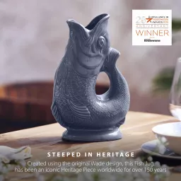 Add a touch of UK ceramic heritage to your home with this 0.6L Fish Jug from Wade. Created using the original iconic Wade design that continues to delight homes across the world for over 150 years. This fish jug is the perfect statement piece for any home. Handcrafted in Stoke-on-Trent, the heart of the pottery industry using English Earthenware, it showcases and celebrates exceptional craftmanship. The 600ml capacity means you can use it as a water jug or wine carafe at family mealtimes or social gatherings, while also being the ideal ornament, vase or table centrepiece, it just oozes style. The unique gurgling sound has long been a hallmark for the jug and it will produce the sound when pouring the jug if it is at least three quarters full. Formed in the shape of a fish, the mouth perfectly lines up to create an easy pour spout, whilst the tail curves up to create an ergonomic handle with a comfortable grip. It is the perfect gift for any heritage brand lover and would be great for weddings, birthdays and housewarming parties. Handwash is recommended to maintain the glaze and to keep the jug looking its best.