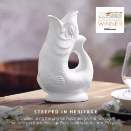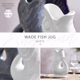 Add a touch of UK ceramic heritage to your home with this 1.2L Fish Jug from Wade. Created using the original iconic Wade design that continues to delight homes across the world for over 150 years. This fish jug is the perfect statement piece for any home. Handcrafted in Stoke-on-Trent, the heart of the pottery industry using English Earthenware, it showcases and celebrates exceptional craftmanship. The 1.2L capacity means you can use it as a water jug or wine carafe at family mealtimes or social gatherings, while also being the ideal ornament, vase or table centrepiece, it just oozes style. The unique gurgling sound has long been a hallmark for the jug and it will produce the sound when pouring the jug if it is at least three quarters full. Formed in the shape of a fish, the mouth perfectly lines up to create an easy pour spout, whilst the tail curves up to create an ergonomic handle with a comfortable grip. It is the perfect gift for any heritage brand lover and would be great for weddings, birthdays and housewarming parties. Handwash is recommended to maintain the glaze and to keep the jug looking its best.