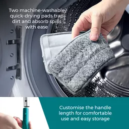 Two machine-washable pads are supplied for convenience. Microfibre technology traps dirt, dust and spills more effectively than cotton for more thorough cleaning