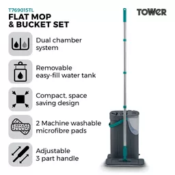 The Tower Flat Mop and Bucket Set delivers hygienic cleaning with its dual-chamber system that separates clean and dirty water. Featuring a removable easy-fill tank and a drainage plug for mess-free emptying, it includes two machine-washable microfibre pads for long-lasting performance. The slim bucket design saves space, while the adjustable three-part handle ensures comfort. Finished in anthracite and teal