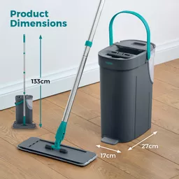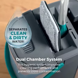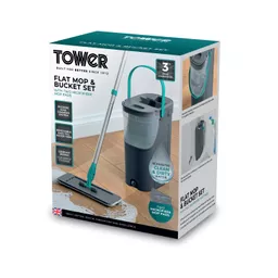 The Tower Flat Mop and Bucket Set with 2 Washable Pads combines hygienic cleaning and practical design. Its dual-chamber system separates clean and dirty water, so you always mop with fresh solution for streak-free results. The removable 1.8L clean-water tank makes filling simple, while the 5.5L dirty chamber includes a plug for quick, controlled draining. Two reusable microfibre pads are included, trapping dust, dirt and spills for a deeper clean. Machine washable and quick-drying, they reduce disposable waste while delivering long-term value. The three-part screw-together handle adjusts to suit different user heights and compacts down for storage. Lightweight yet durable, with a slim design that fits neatly into cupboards, this mop and bucket set is built to last. Finished in anthracite and teal, it with the Tower Cleaning range to bring style and efficiency to everyday home care