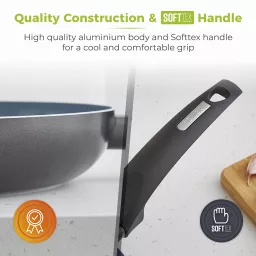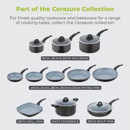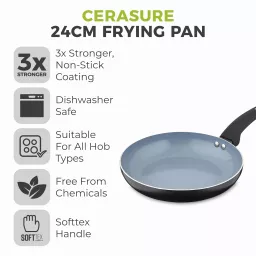 This Cerasure 24cm frying pan by Tower is the perfect choice for toxin and less-oil cooking - ideal for any avid cook. Constructed from high quality aluminium, this frying pan is a great all-rounder size for all frying tasks; from tasteful stir fry's and cheesy omelettes. The Cerasure ceramic non-stick coating is 3x stronger than others, requiring little oil for a healthier alternative and preventing food from sticking to the pan. For added convenience, the pan is dishwasher safe, although hand wash recommended to maintain its finish, as well as suitable for all hob types, including induction. Cerasure ceramic coating is PFAS, PFAO, PTFE, lead and cadmium free - perfect for all levels of cooks. It's bonded steel base heats evenly with no hot spots, ensuring thoroughly cooked food. Keeping the environment in mind, the product and the packaging is 100% recyclable. The softtex handle with ergonomic, phenolic design stays cool to touch for a comfortable grip.