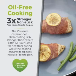 This Cerasure 28cm frying pan by Tower is the perfect choice for toxin and less-oil cooking - ideal for any avid cook. Constructed from high quality aluminium, this frying pan is a great all-rounder size for all frying tasks; from tasteful stir fry's and cheesy omelettes. The Cerasure ceramic non-stick coating is 3x stronger than others, requiring little oil for a healthier alternative and preventing food from sticking to the pan. For added convenience, the pan is dishwasher safe, although hand wash recommended to maintain its finish, as well as suitable for all hob types, including induction. Cerasure ceramic coating is PFAS, PFAO, PTFE, lead and cadmium free - perfect for all levels of cooks. It's bonded steel base heats evenly with no hot spots, ensuring thoroughly cooked food. Keeping the environment in mind, the product and the packaging is 100% recyclable. The softtex handle with ergonomic, phenolic design stays cool to touch for a comfortable grip.
