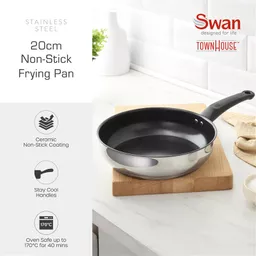 Introduce a premium upgrade to your everyday cooking with the Swan Townhouse 20cm frying pan. From fried eggs to sautéed vegetables and sauces, the polished stainless steel body provides long-lasting durability and kitchen elegance. It features a ceramic coated non-stick surface that’s 3x tougher than conventional coatings, meaning less oil for healthier cooking and effortless food release. Perfect for the style-conscious home cook, this non stick stainless steel frying pan works on all hob types, including induction, and is oven safe up to 170°C. The Thermocore base ensures fast, even heat, while the soft-touch Bakelite handle stays cool and includes a handy hanging loop. Whether you're equipping your first kitchen or looking to upgrade, this non stick induction frying pan makes every cooking session smoother. Dishwasher safe and free from PTFE, PFOA, Lead and Cadmium. The Swan Townhouse collection combines striking modern design with beautiful detailing in sleek finishes with coordinated colours.