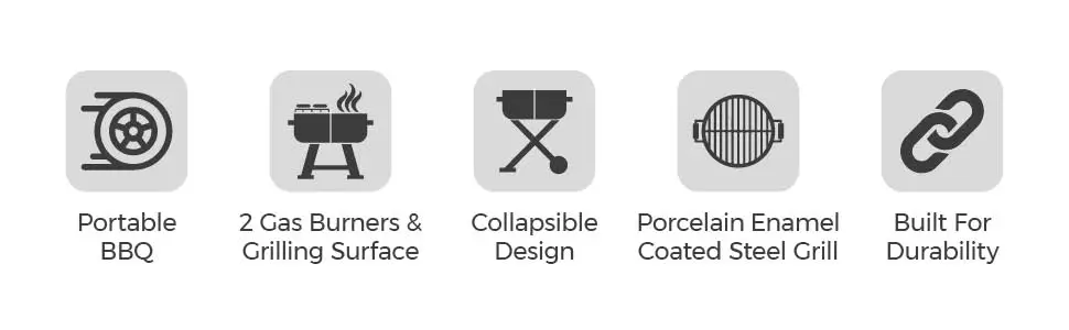Hose and UK regulator included / Uses propane gas (Not included)Serves 2 to 4 people / Grill size: 62.6 x 34.2cm