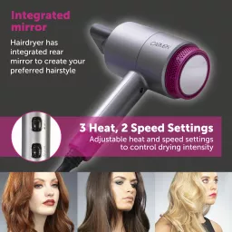 Adjustable heat and speed settings to control drying intensity for styling that suites all hair types Hairdryer has 3-heat and 2-speed settings along with an integrated rear mirror to create your preferred style, no matter what your hair type