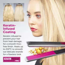 Keratin-infused to prevent your hair from heat damage, for a smooth frizz-free finish. Heats up to 210°C to smooth out delicate strands for a flawless look. Adjust the temperature to create different styles from straight sleek to waves or curls using the ceramic plates