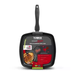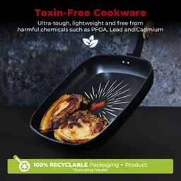 This SmartStart Forged grill pan is free from harmful chemicals such as PFOA, Lead and Cadmium. The pan is lightweight and ultra-tough, thanks to expertly crafted 3.5mm thick forged aluminium. Great heat conductivity properties and lightweight design ensures quick heat-up time with easy manoeuvrability