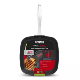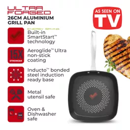 Presenting innovative SmartStart technology, the 4.5mm forged aluminium grill pan lets you cook like a Pro. Perfectly cook a juicy steak by watching the indicator tick in the middle of the pan. When it changes to dark red, the optimum temperature of 200C has been reached, so you can start cooking. The 6 layer non-stick Aeroglide Ultra interior coating is 15x stronger than standard non-stick coatings. It’s free from PFOA, Lead and Cadmium so you can cook healthy meals without harmful toxins. The grill pan has an Inducto™ Bonded Steel Base, which uses unique bonded base channels for even heat distribution, preventing hotspots and uneven cooking, while the riveted steel handle provides comfort and easy manoeuvrability. The Aeroglide Ultra non-stick coating is abrasion resistant, so you can use metal utensils without damaging the pan. It is suitable for all hobs, including induction, whilst the Inducto™ base heats up 25% faster than standard induction bases. It’s also dishwasher friendly for easy cleaning
