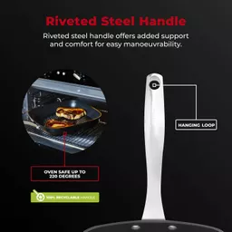 Riveted steel handle offers added support and comfort for easy manoeuvrability. The handle can be used in the oven without a time limit.