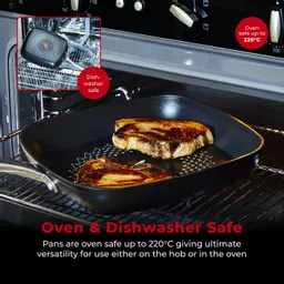The grill pan is oven safe up to 220C, thanks to the steel handle, giving ultimate versatility for use either on the hob or in the oven