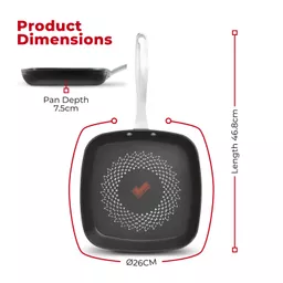 This 26cm grill pan provides enough cooking space for family meals and entertaining, so you can serve up juicy steaks and flavoursome veggie burgers with ease