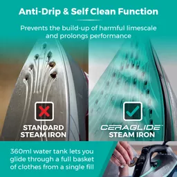 Anti-drip prevents staining of clothes, whilst anti-calc protects against lime scale with a self-cleaning button to help flush out any build-up
