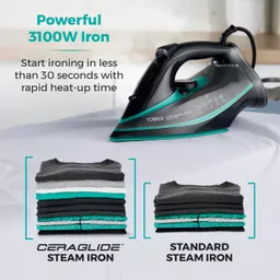 Glide through a full basket of ironing effortlessly with Tower’s Black and Teal Ultra-speed Iron. Offering a powerful 3100W output, the iron rapidly heats up to make short work of ironing, while complete with a Ceraglide ceramic soleplate that is non-stick & scratch resistant for 30% faster ironing.