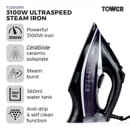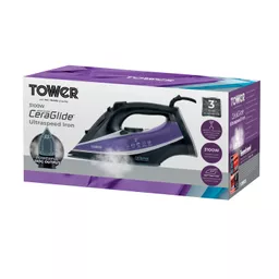 Glide through a full basket of ironing effortlessly with Tower’s Black and Rose Gold Ultra-speed Iron. Offering a powerful 3100W output, the iron rapidly heats up to make short work of ironing, with a precision tapered tip for easy ironing around buttons and difficult areas. Featuring an impressive non-stick, scratch resistant CeraGlide ceramic soleplate, it effortlessly glides through ironing, making it 30% faster. The 40g/min of continuous steam ensures light work of most fabrics, whilst the powerful 180g steam boost tackles stubborn creases with ease. The large 360ml water tank prevents constant refilling and the anti-drip and self-clean functions prevents build-up of harmful scale and prolongs its performance.