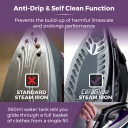 Self-clean and anti-scale functions prevent build-up of harmful scale and prolongs the performance and life of the iron.