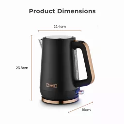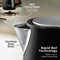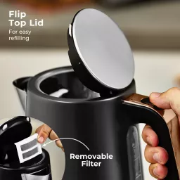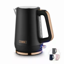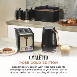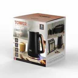 Add contemporary style and everyday convenience to your kitchen with the Tower Cavaletto 1.7L Jug Kettle. Powered by a 3KW rapid boil element, it heats water in just 45 seconds, ideal for busy mornings or when hosting guests. The 1.7L capacity serves up to 7 cups from a single fill, while the water gauge window ensures accurate measuring. A durable stainless steel body and perfect pour spout offer strength, precision, and safety, helping prevent boiling hot spillages. The 360° swivel base provides easy handling for both left- and right-handed users, with integrated cord storage to keep countertops tidy. A push-button flip lid allows quick refilling, and the removable limescale filter keeps water fresh. Complete with an illuminated power switch, boil-dry protection, and automatic shut-off, this sleek black and rose gold kettle delivers reliable performance with signature Cavaletto elegance.