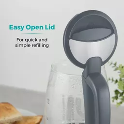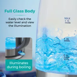 Large 2200W 1.7 Litre Capacity Boils 7 cups at onceGlass body with black plastic and stainless steel housing