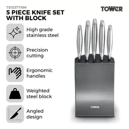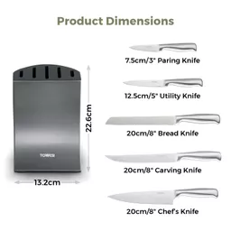 The Tower Core 5 Piece Knife Set with Block combines durability, style, and practicality for the modern kitchen. Each knife is crafted from high-grade polished stainless steel, offering long-lasting sharpness and durability. Fine edge blades deliver precision cutting, while ergonomic handles ensure comfortable, controlled use. The weighted steel block provides safe, stable storage, with an angled design for easy knife removal. Complete with a bread knife, carving knife, chef knife, utility knife, and paring knife, this versatile set is perfect for all your everyday food preparation needs