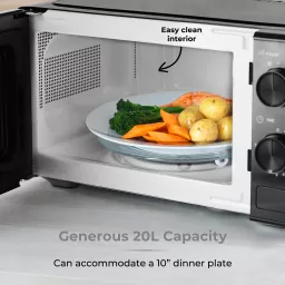 Spacious 20L capacity can easily fit a standard 10” dinner plate, allowing you to cook full family meals in no time, whilst the high quality glass turntable rotates in the microwave to ensure thorough cooking with delicious results